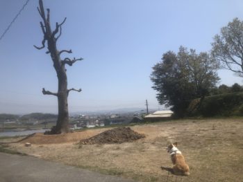 先日(4/9)敷地内に地元の造園屋さんに樹齢約80年のクスノキを植えてもらいました。